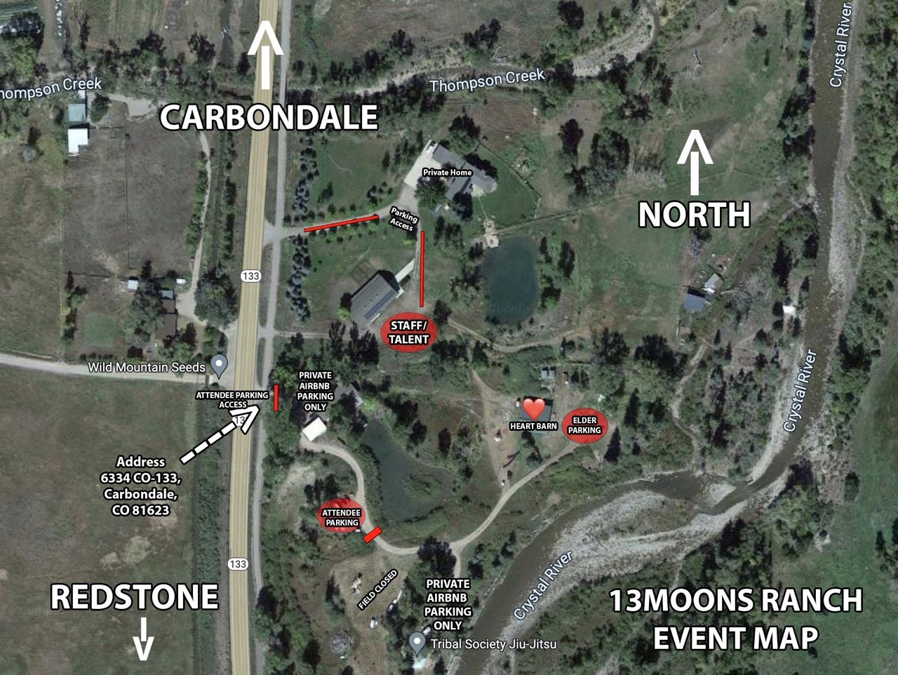 If arriving from Carbondale, you’ll see the 13 Moons sign on the left just after crossing Thompson Creek Bridgeand passing Sustainable Settings on your right. Turn left at the 13 moons sign.